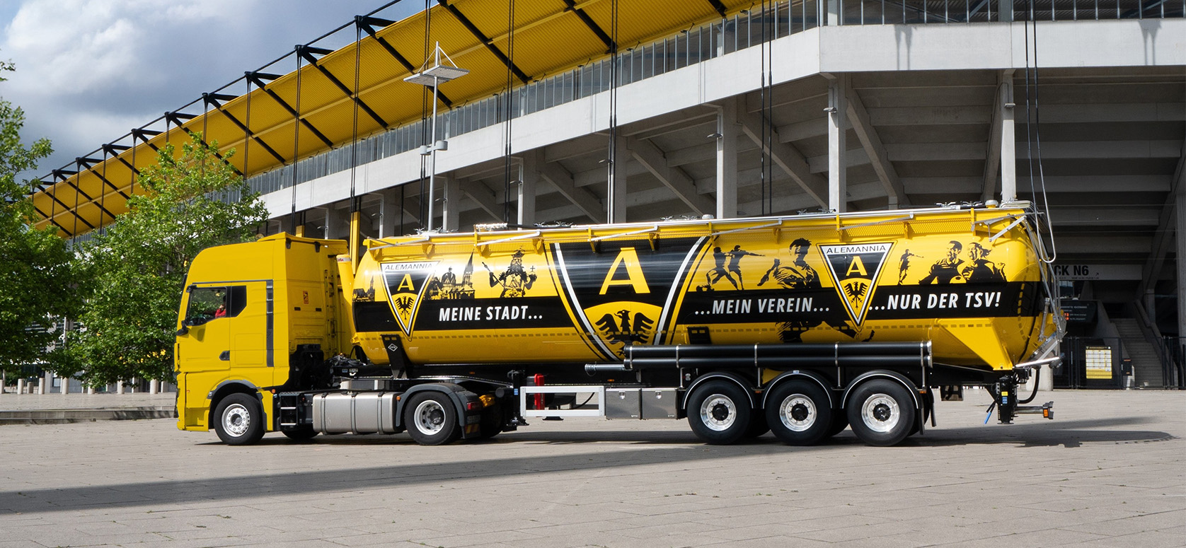 Der Mut zur Veränderung zeigt sich nicht nur intern – sondern auch auf der Straße. Die Idee, zwei Silozüge im Design ihres Herzensvereins Alemannia Aachen zu gestalten, war mehr als ein Gag. Sie ist Ausdruck tiefer Verbundenheit mit der Region, dem Verein – und dem Unternehmen selbst.